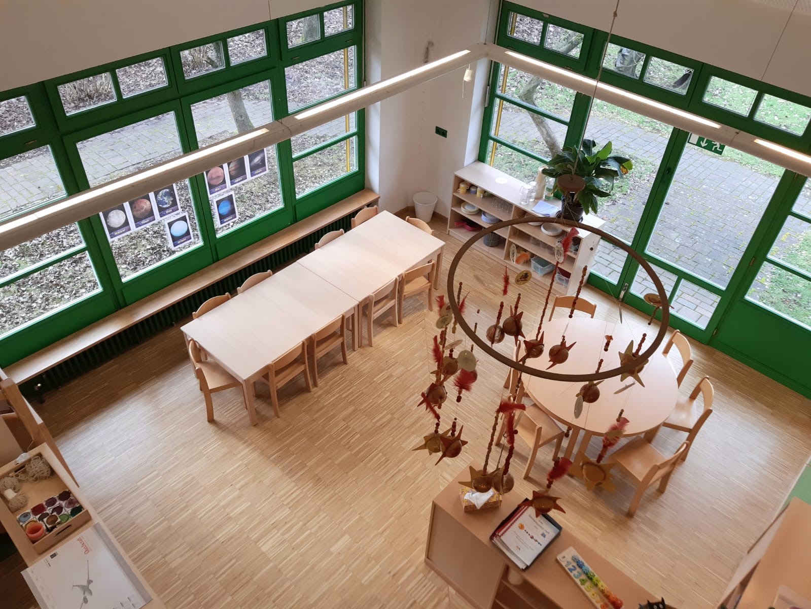Jeder Gruppenraum hat einen Zusatzraum im Obergeschoß: Lernwerkstatt, Lichterwerkstatt, Bärenraum. Die gemeinsame Turnhalle befindet sich ebenfalls im Obergeschoß